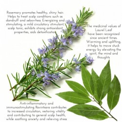 Anti-inflammatory and immunostimulating Ravintsara contributes to increased circulation, restoring vitality and contributing to general scalp health, while soothing anxiety and relieving stress.