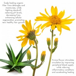 Scalp-healing organic Aloe Vera detangles and moisturizes, while fighting dandruff, restoring pH levels, decreasing frizz, enhancing cellular regeneration, promoting new healthy hair growth.