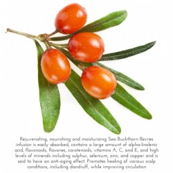 Rejuvenating, nourishing and moisturizing Sea Buckthorn Berries infusion is easily absorbed, contains a large amount of alpha-linolenic acid, flavonoids, flavones, carotenoids, vitamins A, C, and E, and high levels of minerals including sulphur, selenium, zinc, and copper and is said to have an anti-aging effect. Promotes healing of various scalp conditions, including dandruff, while improving circulation.