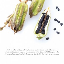 Rich in fatty acids, proteins, lignans, amino acids, antioxidants and minerals (calcium, copper, magnesium, zinc) Sesame Oil has powerful therapeutic properties to help control dandruff, dry scalp and psoriasis.