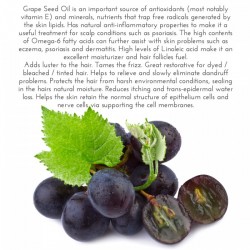 Grape Seed Oil is an important source of antioxidants (most notably vitamin E) and minerals, nutrients that trap free radicals generated by the skin lipids. Has natural anti-inflammatory properties to make it a useful treatment for scalp conditions such as psoriasis. The high contents of Omega-6 fatty acids can further assist with skin problems such as eczema, psoriasis and dermatitis. High levels of Linoleic acid make it an excellent moisturizer and hair follicles fuel. Adds luster to the hair. Tames the frizz. Great restorative for dyed / bleached / tinted hair. Helps to relieve and slowly eliminate dandruff problems. Protects the hair from harsh environmental conditions, sealing in the hairs natural moisture. Reduces itching and trans-epidermal water loss. Helps the skin retain the normal structure of epithelium cells and nerve cells via supporting the cell membranes.